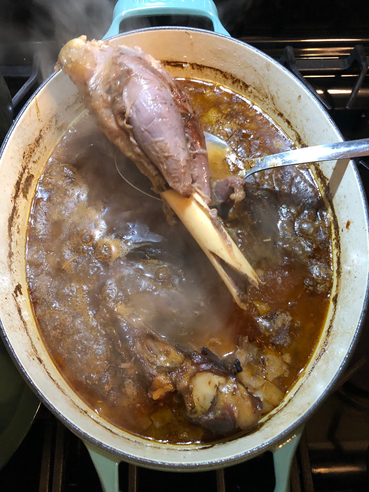 And the onions and cinnamon in the dutch oven until they are translucent then add the garlic. Add more oil if you need it. Stir, and add tomato paste once the garlic takes on some color. Pour in the red wine and deglaze, scraping all the great brown bits from the bottom. Remove the shanks from the stockpot and add to the dutch oven. Strain the beans but reserve their cooking liquid. Add the beans in with the shanks, and add enough bean liquor to cover shanks.